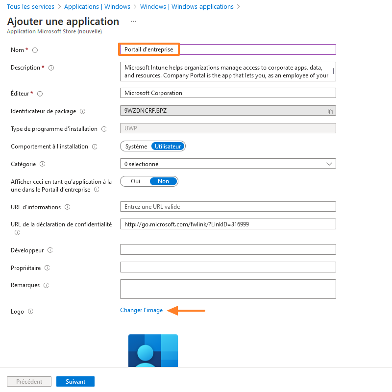 Ensuite, vous devez configurer cette application. Vous pouvez commencer par indiquer son nom en français, à savoir "Portail d'entreprise". Vous avez le choix entre une installation par utilisateur ou par machine (système). Indiquez également un logo, que vous pouvez récupérer sur Google via une recherche d'image.