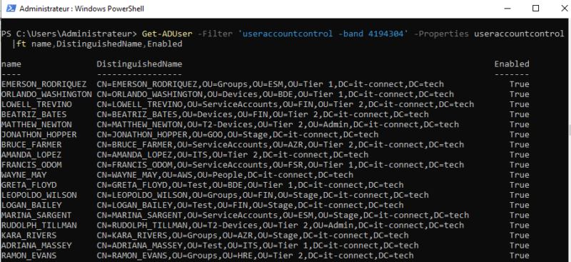 Chaque ligne commence par le nom de l'utilisateur utilisé pour l'énumération ("[IT-CONNECT\Administrateur@AD01]" :