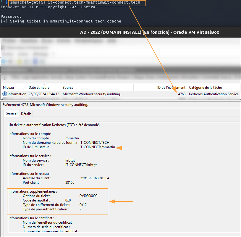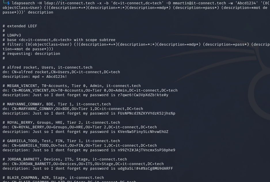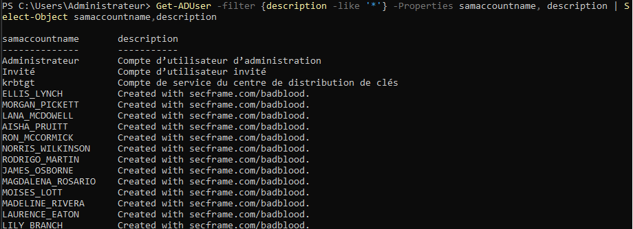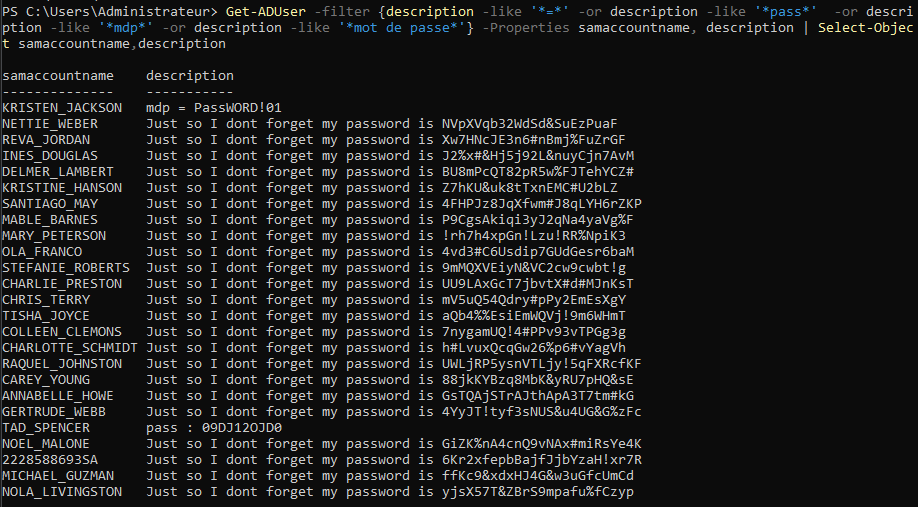 Chaque ligne commence par le nom de l'utilisateur utilisé pour l'énumération ("[IT-CONNECT\Administrateur@AD01]" :