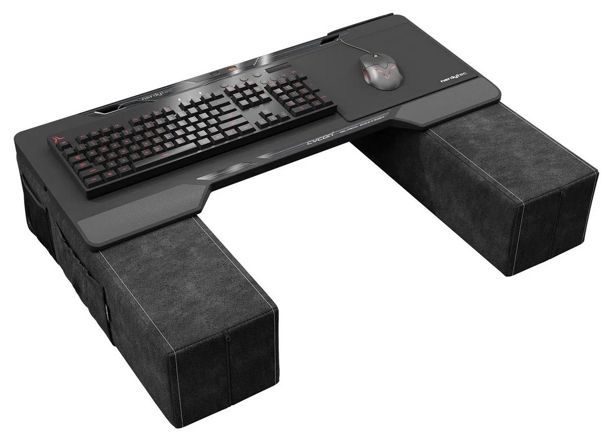 Imaginez un instant : vous êtes installé confortablement dans votre canapé, accompagné par deux coussins très confortables, un de chaque côté pour poser vos coudes, et un plateau pour accueillir votre ensemble clavier-souris préféré, voire même un ordinateur portable. C'est la promesse des produits de chez Nerdytec, et plus particulièrement du Couchmaster CYCON² !
