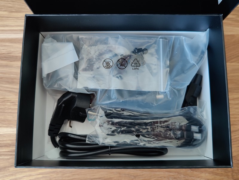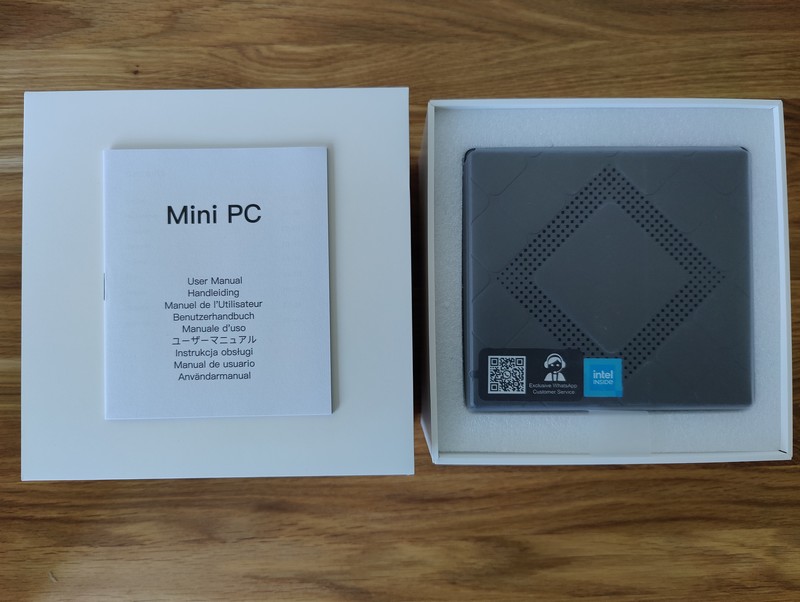Qu'avons-nous à l'intérieur de la boite ? Le mini PC est accompagné par l'alimentation externe et son câble, ainsi qu'un câble HDMI, un support VESA (et les vis), une notice d'utilisation (en français, utile si vous envisagez d'utiliser le support VESA pour fixer le PC à l'arrière d'un écran), et une rallonge SATA à utiliser si vous souhaitez ajouter un disque SATA 2.5 pouces.