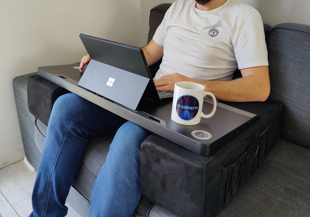 Me voici en place avec mon ordinateur, installé confortablement sur le canapé, grâce aux coussins et au plateau du Couchmaster. Les coussins sont très confortables et agréables, et grâce à eux, cela devient facile de travailler (ou jouer) depuis son canapé, car nous sommes bien installés. Les coudes sont maintenus par les coussins, ce qui permet de se mettre à l'aise que ce soit pour utiliser un ordinateur portable ou un kit clavier et souris. Nous pouvons rester dans cette position plusieurs heures, sans ressentir de gêne.