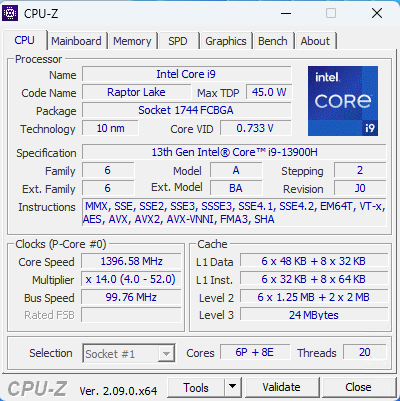 Ce mini PC, avec un boitier très compact, est propulsé par un processeur Intel Core i9 de 13ème génération lancé au premier trimestre 2023. Le modèle i9-13900H a14 cœurs et 20 threads, 24 Mo de cache et sa fréquence maximale en mode Turbo est 5,40 GHz.