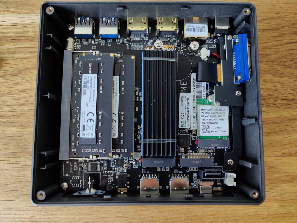 À l'intérieur du boitier, il y a un espace confortable entre les différents composants, mais ce sera différent si vous ajoutez un disque SATA 2.5 pouces. Néanmoins, il est important de préciser que ce boitier est un peu plus grand que beaucoup d'autres modèles de mini PC. Voici ce qui est à noter :