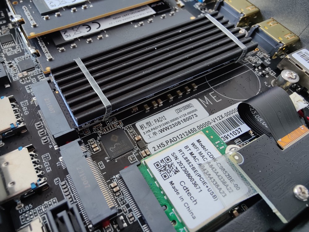 Il y a un disque SSD NVMe, équipé d'un dissipateur et d'une épaisse couche de pâte thermique. C'est appréciable (mais ceci nous empêche de lire l'étiquette pour en savoir plus sur la référence).