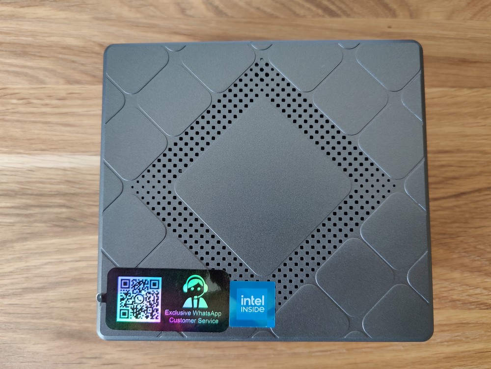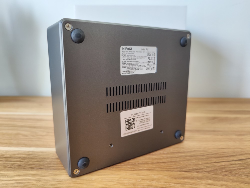 Le boitier gris anthracite de ce mini PC NiPoGi est entièrement en plastique. Le plastique est rigide et semble relativement solide. Le boitier est correctement assemblé et tous les ports sont bien accessibles : aucun défaut n'est à relever. La seule chose qui me gêne réellement, c'est l'emplacement hasardeux des deux stickers sur le dessus du boitier (que l'on peut retirer facilement). En dessous, nous retrouvons 4 patins antidérapants d'une épaisseur de 4 mm. Nous constatons qu'il y a une entrée d'air sur le dessus, mais aussi en dessous du boitier, tandis que l'extraction de l'air s'effectue par l'arrière du boitier.