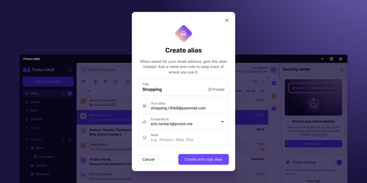 Dès aujourd'hui, vous pouvez utiliser la fonctionnalité d'alias "Hide-my-email" directement dans Proton Mail, et sans frais supplémentaire. À quoi sert cette fonctionnalité ? Faisons le point !